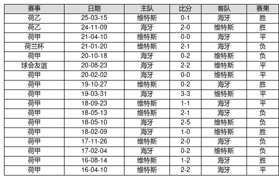 海牙 VS 维特斯两队近10年的交战次数为17场,海牙5胜6平6负,赢球概率为29.4%,平局概率为35.3%,输球概率为35.3%。