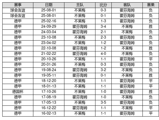 不莱梅 VS 霍芬海姆两队近10年的交战次数为20场,不莱梅4胜5平11负,赢球概率为20.0%,平局概率为25.0%,输球概率为55.0%。