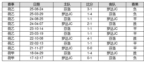 罗达JC VS 芬洛两队近10年的交战次数为11场,罗达JC3胜5平3负,赢球概率为27.3%,平局概率为45.5%,输球概率为27.3%。