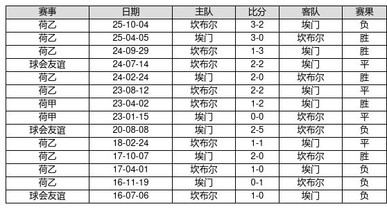 埃门 VS 坎布尔两队近10年的交战次数为14场,埃门5胜4平5负,赢球概率为35.7%,平局概率为28.6%,输球概率为35.7%。
