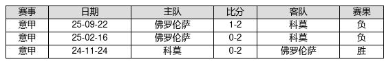 佛罗伦萨 VS 科莫两队近10年的交战次数为3场,佛罗伦萨1胜0平2负,赢球概率为33.3%,平局概率为0.0%,输球概率为66.7%。