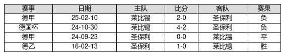 圣保利 VS 莱比锡两队近10年的交战次数为4场,圣保利1胜1平2负,赢球概率为25.0%,平局概率为25.0%,输球概率为50.0%。