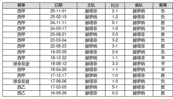 赫罗纳 VS 赫塔菲两队近10年的交战次数为15场,赫罗纳6胜3平6负,赢球概率为40.0%,平局概率为20.0%,输球概率为40.0%。