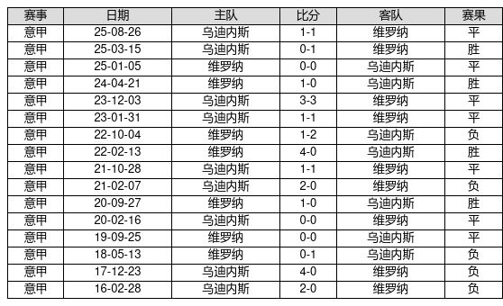 维罗纳 VS 乌迪内斯两队近10年的交战次数为16场,维罗纳4胜7平5负,赢球概率为25.0%,平局概率为43.8%,输球概率为31.2%。