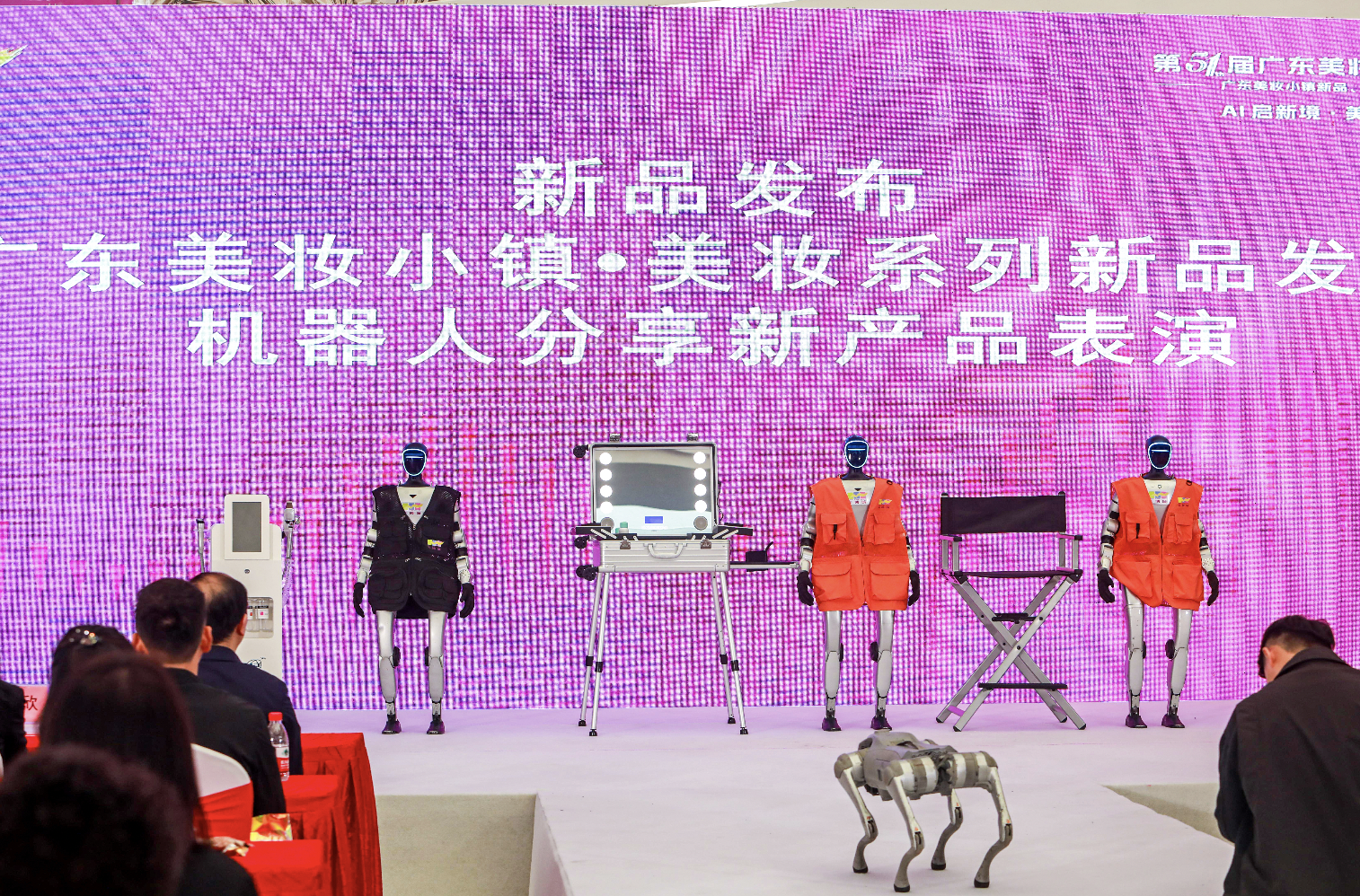 新潮发布环节,国际大师分享与小镇趋势深度融合,重点解读了生命健康导向下,先进材料应用与美妆功效升级的行业新趋势,呼应美博城“推广场”的潮流引领作用,助力广州时尚商贸业品牌化、国际化发展;新品发布环节,机器人再度登场,以科技感方式呈现核心美妆产品,其中不乏采用合成生物、植物精萃等先进材料研发的健康美妆新品,这些产品已在美博城及全球美妆选品中心完成场景化应用落地,既落实两会“推动重点行业AI商业化应用”的要求,更依托广州火车站片区商圈区位优势,为全球采购商提供直观体验,强化美博城“应用场”的实践价值,推动美妆新品借助广州开放平台走向全球。